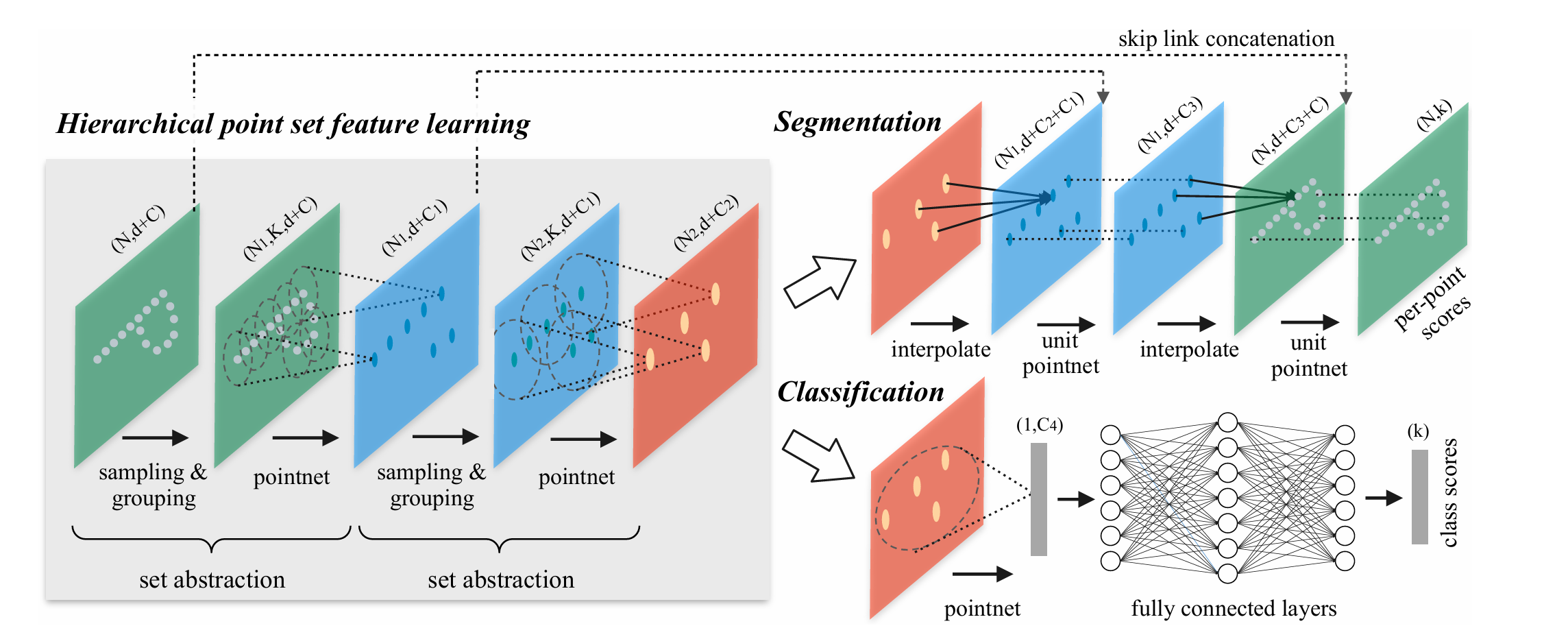 上图中左侧,每一层上有一个括号,其中N代表点的数量,d代表d维坐标,C代表C维点特征向量,K代表一个邻域中的点的数目。那么对于