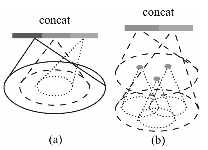 上图的(b)即为MRG,左边的特征向量来自对每一个组领域进行特征提取并总结得到的,方法是使用set abstraction;右边的特征向量来自将原始点通过PointNet网络后得到的特征。